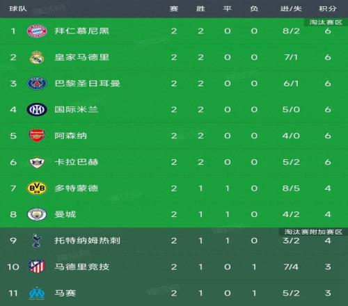 北京時間10月2日,歐冠第二輪剩下的7場比賽結(jié)束,我們一起看看最新積分榜變動,主要的信息如下:巴黎2-1絕殺巴薩,阿森納2-0輕取奧林匹亞科斯,曼城2-2摩納哥、多特蒙德4-1畢爾巴鄂競技,勒沃庫森1-1PSV埃因霍溫,尤文2-2比利亞雷亞爾,那不勒斯2-1葡萄牙體育!