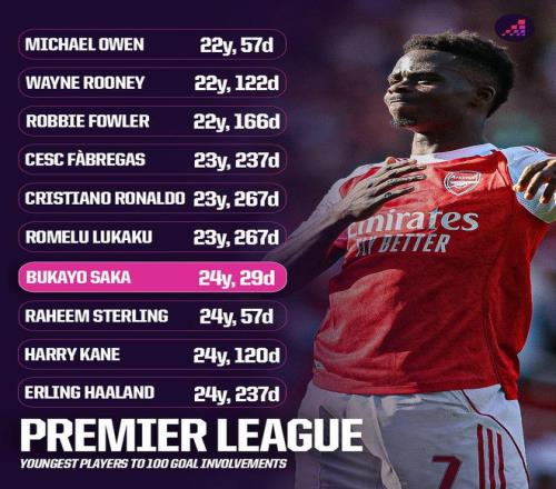在與西漢姆聯(lián)的比賽中,薩卡打入一球,達(dá)成英超生涯參與100球里程碑(55球45助),據(jù)統(tǒng)計(jì),24歲29天的薩卡是英超歷史上參與100球第七年輕的球員。