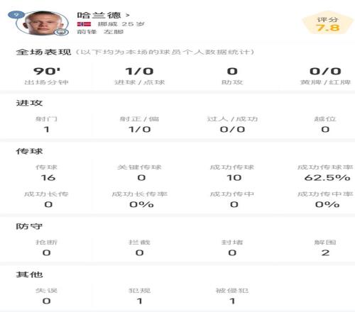 此役哈蘭德首發(fā)并踢滿全場(chǎng),打入全場(chǎng)唯一進(jìn)球,全場(chǎng)比賽哈蘭德只貢獻(xiàn)了1腳射門,就收獲進(jìn)球,16次傳球,成功率62.5%,防守端貢獻(xiàn)2次解圍,賽后機(jī)器評(píng)分7.8分。