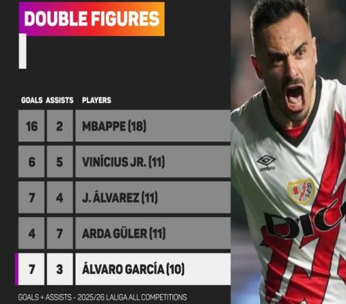 阿爾瓦羅加西亞是本賽季五大聯(lián)賽首位制造進球上雙的西班牙球員