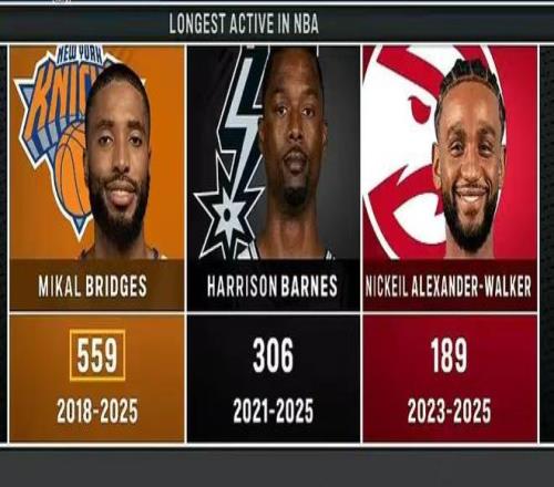 第三節(jié)直播畫(huà)面當(dāng)中,提到了現(xiàn)役球員連續(xù)出勤紀(jì)錄,尼克斯球員布里奇斯連續(xù)出戰(zhàn)559場(chǎng)斷層領(lǐng)先其他球員。