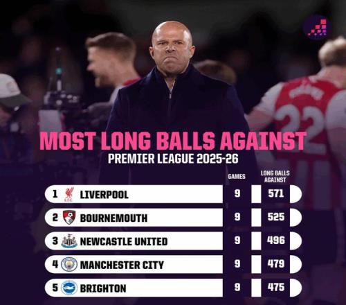 從統(tǒng)計數(shù)據(jù)可以看到,利物浦新賽季9場英超比賽,被對手用571次長傳發(fā)起攻擊,是所有球隊中最多的。