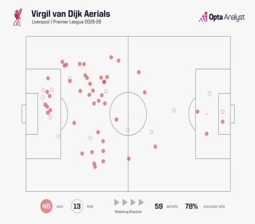 問題是本賽季的范迪克在這方面的效率大幅下降,哪怕數(shù)據(jù)上看,59次高球一對一贏下46次,成功率高達78%,但實際上對于落點的控制卻大不如前。