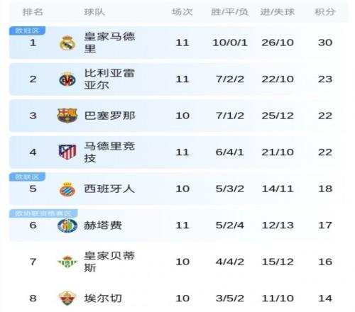 西甲聯(lián)賽最新積分榜如下: