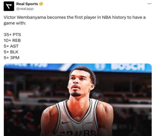 本場是文班生涯第6次單場交出至少5記三分5次封蓋,刷新自己保持的NBA歷史紀(jì)錄,牢牢占據(jù)歷史第一位置。