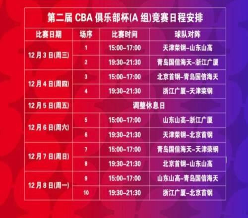 第二屆CBA俱樂部杯賽區(qū)抽簽結(jié)果已于昨日揭曉,備受關注的長沙賽區(qū)小組賽將于12月3日-8日在賀龍體育館拉開戰(zhàn)幕。北京首鋼與青島國信海天、天津榮鋼、浙江廣廈、山東山高五支勁旅齊聚A組,即將展開激烈角逐。