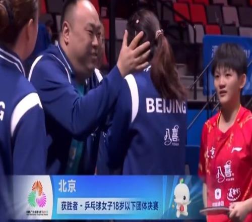 隨著祝啟慧在第四局以12比10擊敗姜依依,以3比1贏下第五場(chǎng)對(duì)決,北京U18女隊(duì)以總比分3比2獲勝,奪得了粵港澳全運(yùn)會(huì)乒乓球項(xiàng)目的第一塊金牌。祝啟慧回到場(chǎng)邊,這時(shí)候北京U18女隊(duì)個(gè)個(gè)喜極而泣,北京隊(duì)的主教練也非常興奮,他揉揉了祝啟慧的頭。祝啟慧一臉平靜地看著還在激動(dòng)落淚的姐姐們。沒(méi)錯(cuò),祝啟慧是北京U18女乒年齡最小的隊(duì)員,如今只有13歲,但跳級(jí)參賽的她是北京U18女隊(duì)的頭號(hào)選手。在這場(chǎng)擊敗山東U18女乒的比賽中,祝啟慧一人獨(dú)取2分,分別擊敗了國(guó)青隊(duì)的丁怡婕和姜依依。