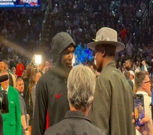 伊巴卡來到雷霆主場見證頒獎時刻,與前隊友杜蘭特寒暄