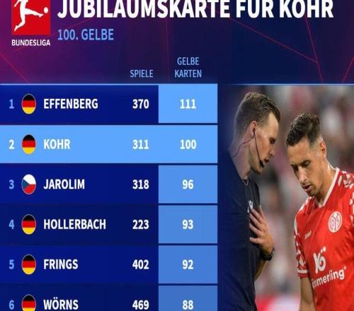 黃卡大師,美因茨后衛(wèi)科爾是德甲歷史上唯二染黃破百的球員
