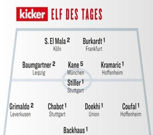 踢球者評選德甲第7輪最佳陣容:凱恩領(lǐng)銜,科隆天才馬拉在列